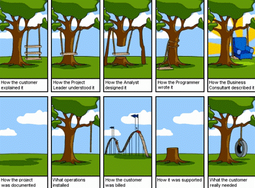 A secondary problem that the cartoon also highlights is the information handover. We address this the same way – with clear subject matter written documentation. However, we also acknowledge that the architect will need to spend time on spreading and refining basic subject matter knowledge and help putting it into different solution contexts – most prominently to technology experts like systems configuration experts, software developers and security and infrastructure architects. Hence, we often think of the IT Architect as the man/woman in the elevator, as he/she travels up and down in the house of stakeholders and competences.